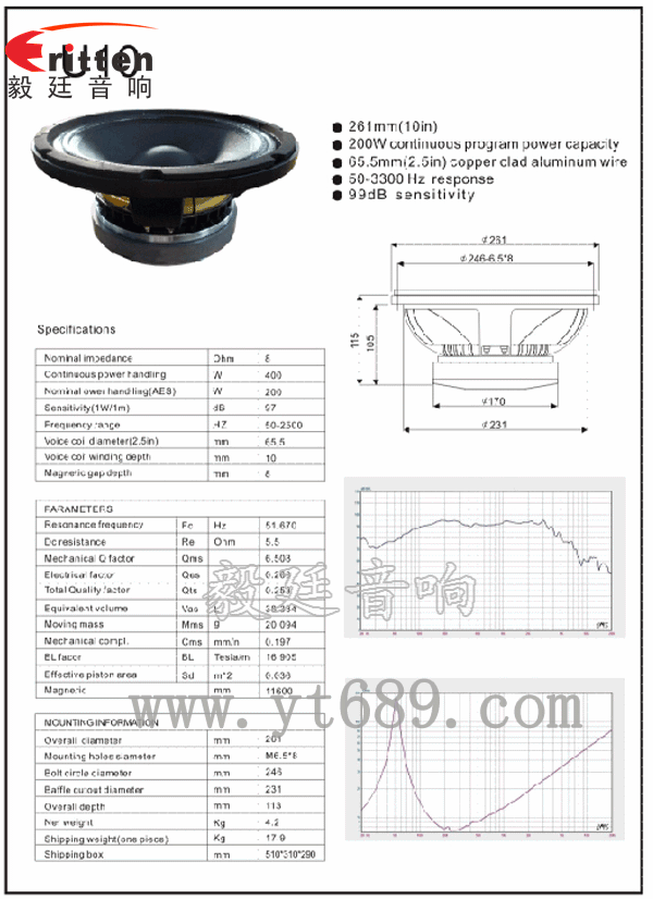 此款優(yōu)異用于10寸200瓦大功率低音喇叭,額定功率為200W,最大功率為400W,毅廷音響科技有限公司工程師研發(fā)出超重低音揚(yáng)聲器,震撼強(qiáng),發(fā)燒者的喜愛,值得信賴;
