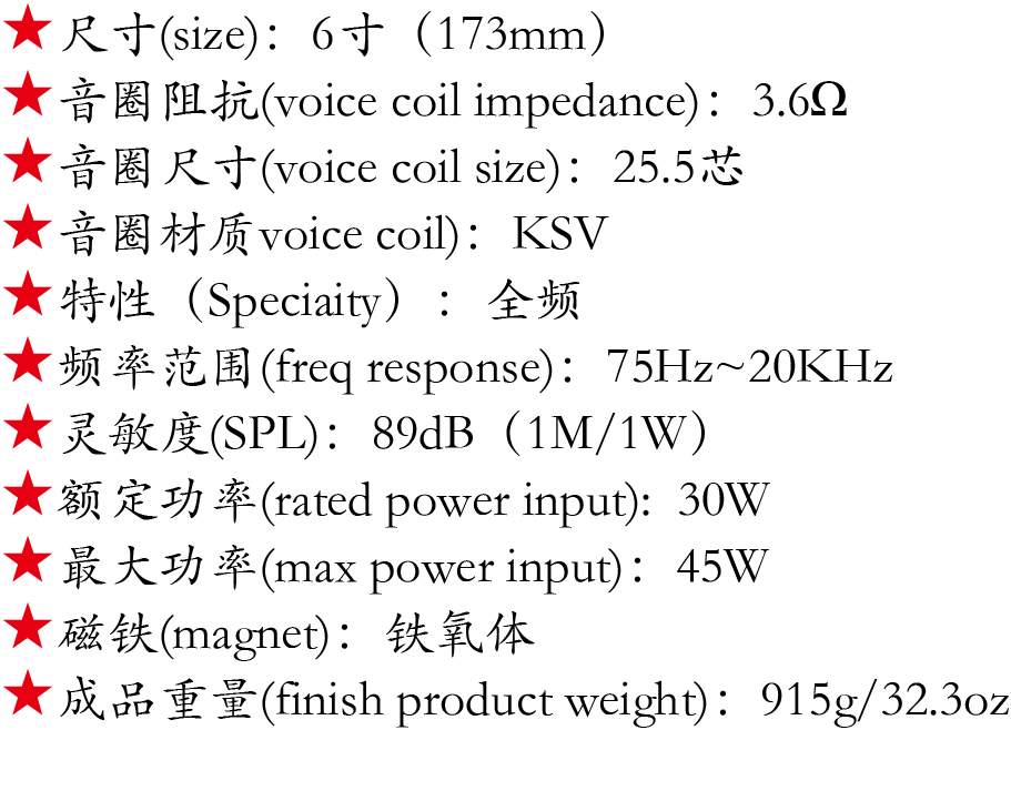 功率:最大45w 功率輸出,防紫外線穩(wěn)定,4 Ω 阻抗 75 - 20,000 赫茲,頻率 89dB (1W/m) 靈敏度 。