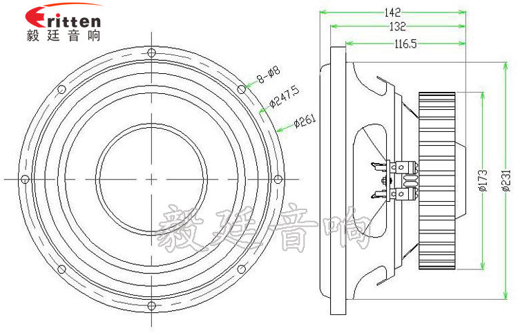 10寸圓形鐵盆架外磁重低音喇叭,采用了高性能鐵氧體,動(dòng)力足,外帶磁鋼套,使喇叭外觀更加完美;