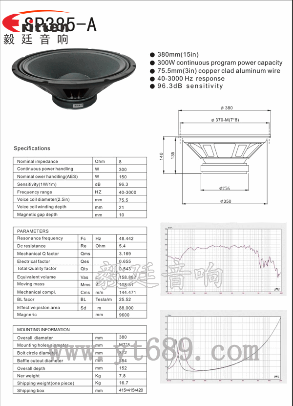 此款15寸75芯150W重低音喇叭,優異用于舞臺音箱喇叭的額定功率為150W,音域40Hz~3KHz,超重低音炮,下潛力深,也可用于KTV音箱、廣場音箱上,用途廣泛。